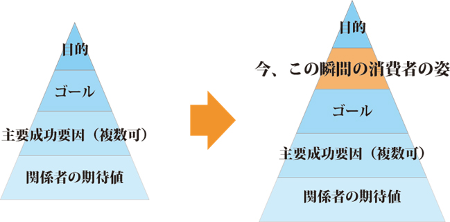 今、この瞬間の消費者の姿をプロジェクトに関わる人全員で確認するのです。「目的」と「ゴール」の間に入れるのです。プロジェクトに集中する(させる)ためには、大きな目的よりも、目の前の消費者の姿が大切という考え方です。「消費者ファースト思考」です。
