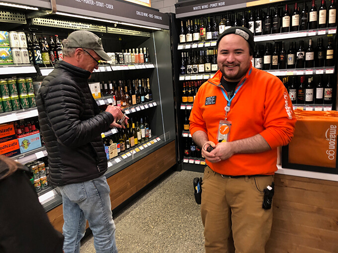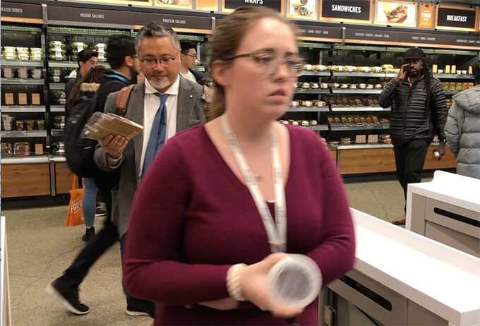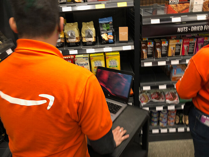 一方で、日本のニュースでも「アマゾンが無人コンビニを開業」などと紹介されている「Amazon Go」ですが、店内は無人どころか至る所にヒトが介在しています。もちろん、基本システムは、カメラとセンサーとAIによる「レジ無しコンビニ」というのが「Amazon Go」の実態です。