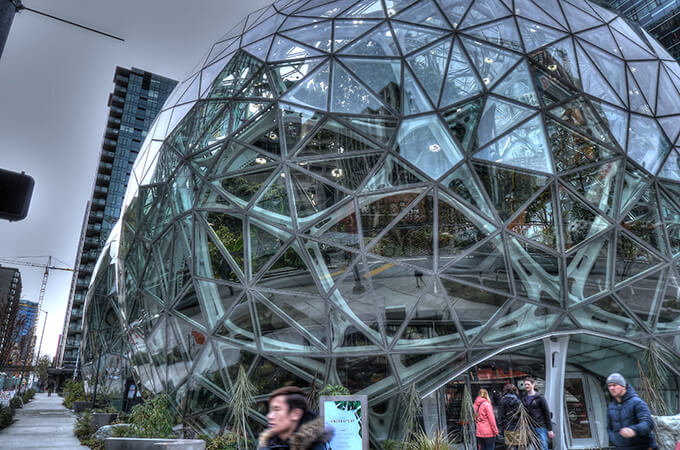 1年間の社内テスト期間を終えて、「Amazon Go」1号店が一般に公開されたのは、スターバックス発祥の地でもある「シアトル」。その中心部は、米アマゾンのキャンパスが占拠しつつあり「HQ1」と呼ばれるいわば「アマゾン村」ともいえるエリアが本社で、HQ2エリアは第二本社機能を持つなどしてアマゾンによる再開発が進んでいる地域です。