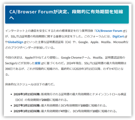 しかしそんな祈りもむなしく、2025年4月 Appleが提案したTLS証明書の有効期間短縮案「SC-081v3」が正式に可決されてしまいました。これにより、現在398日の最大有効期間は今後段階的に短縮し、最終的には47日にまでなる予定となっています。