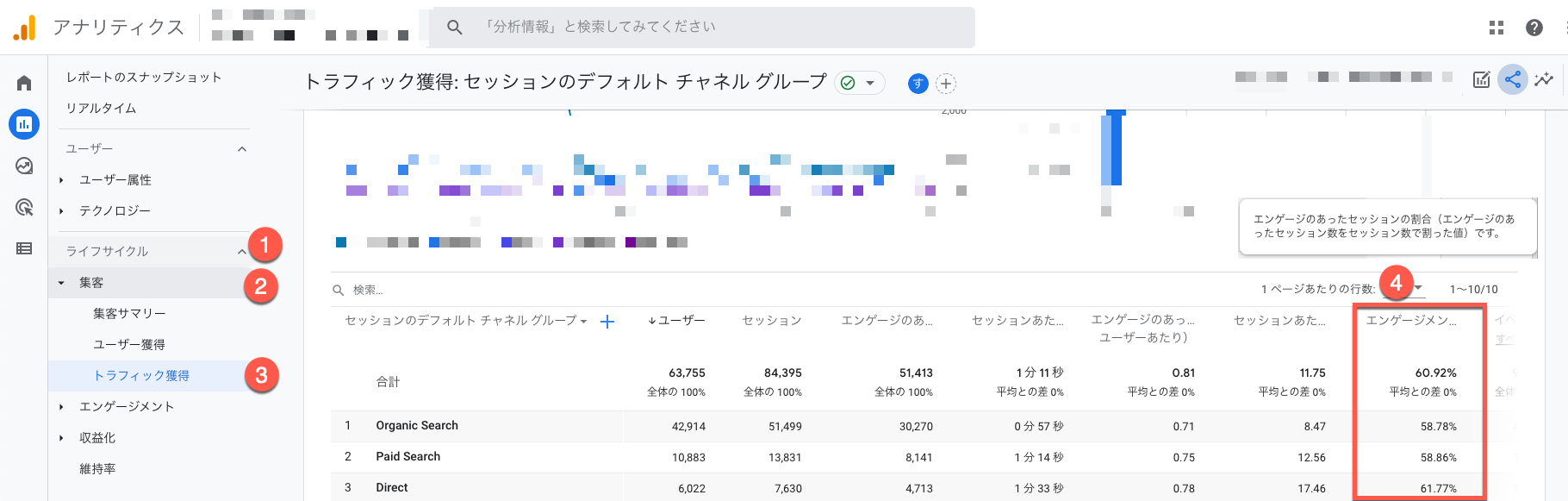 上図のとおり、GA4上で、ライフサイクル>集客>トラフィック獲得で、7つめの%で表示されている指標が「エンゲージメント率」です。実際の画面上でも日本語が見切れるバグで確認しづらいですが、マウスを重ねると「エンゲージのあったセッションの割合(エンゲージのあったセッション数をセッション数で割った値)です。」と表示されます。今まで直帰率をレポートや会議の指標としていた場合は、代わりにエンゲージメント率を使うことになると思います。もし、どうして直帰率が無くなったのか!と説明を求められた場合は「GA4が、サイトだけでなくアプリ解析も兼用するツールのためです。アプリでは直帰という考え方は適切ではないためです。」