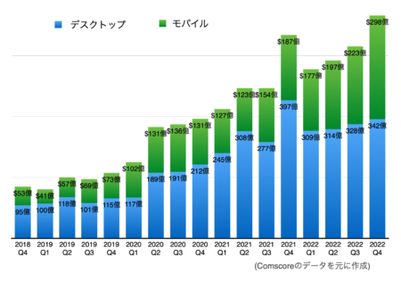 カテゴリー別で最も売上の多い食料品、ベイビー用品、ペット用品は、次のグラフにあるとおり、2018年から2022年末までの4年間で333パーセント増加しました。2018年第4四半期に、アメリカ人が食料品等をオンラインで購入した金額は150億ドル未満でしたが、2022年第4四半期には640億ドルに達しています。そして、そのほぼ半分近くがモバイルデバイスからの売上となっています。