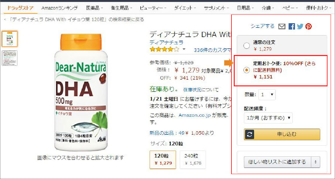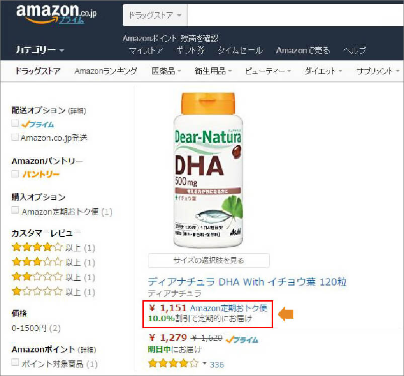 「Amazon定期おトク便10%割引の価格」が表示され、定期おトク便プログラム対象であることがAmazon検索結果からもわかり、購入者にアピールできます。