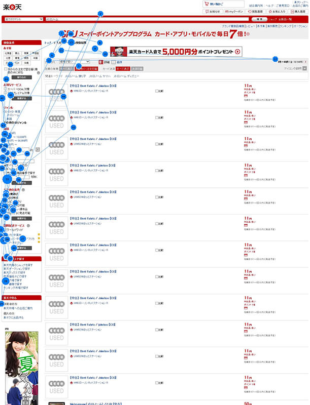 こちらは検索結果を価格の安い順に並び替えた時のゲイズプロットです。USEDのアイコンばかりが並んでしまったため、新品に絞り込みたかったようです。