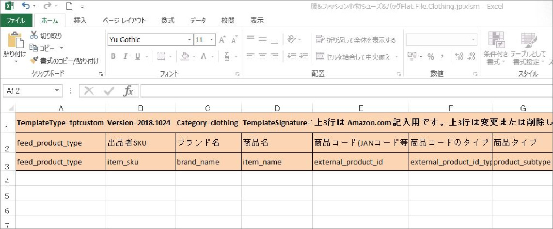Amazonカタログに一括商品登録するには、30種類近くに分類されたカテゴリー別在庫ファイルテンプレート(日本語)が必要です。在庫ファイルテンプレートは、複数の列で構成されたMicrosoft Excelのスプレッドシートで、商品の説明および出品に使用します。各列の定義も記載されており、列(項目)の数は150~500とカテゴリーにより異なります。商品ページの作成と商品の出品に必要なテンプレートの1行目には「TemplateType=fptcustom Version=2018.1024」のようにテンプレートタイプとバージョンが記載されています。下の画像はAmazonによって更新された「服&ファッション小物シューズ&バック」の在庫ファイルテンプレートです。カテゴリーによって異なりますが、在庫ファイルテンプレートは年に何回か更新されます。
