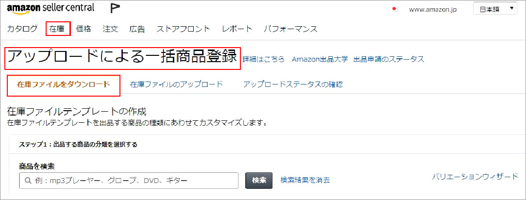 2)「在庫ファイルをダウンロード」タブで、商品分類または検索を使用して、出品する商品のタイプを選択