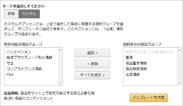 〔カスタム〕:テンプレートに追加したい商品に関連付けられている属性グループを選択できる。