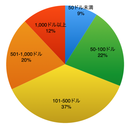 調査レポートによりますと、中小企業が1ヶ月にEメールマーケティングに費やしている金額は右グラフのようになっており、日本円にして大体15,000円から75,000円ほどが最も多い月額投資額となっています。