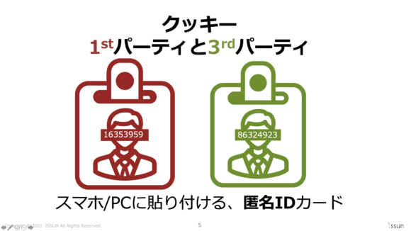クッキーの正体はスマートフォンやパソコンに貼り付ける匿名のIDカードといえます。氏名、年齢は分からないけれども識別番号が付与されているネームカードをイメージしていただければよろしいかと思います。