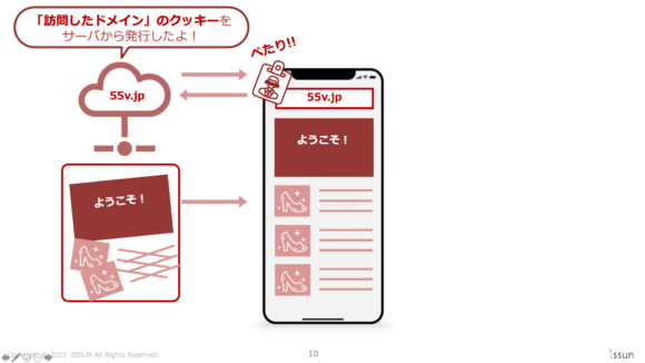 往々にして、この時一緒に「クッキー」が発行されています。どこから発行されるかというと「55v. jp」が、先ほどの画像や文言と同じように、サーバからクッキーをスマホのブラウザに「ピタッ」と貼り付けるわけです。このクッキーはこれ以降、サーバとブラウザで情報交換されることになります。