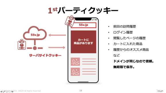 一方、55v . jp に訪れているのに、違うドメインがクッキーを発行する場合があります。これが「サードパーティークッキー」です。現時点では、ほぼこの技術は使われることは無くなっています。ネット上にクッキー狩りの対象となるアップルiPhoneユーザが多いことが理由です。