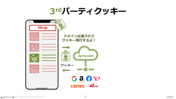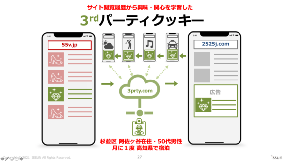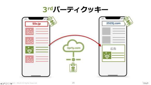たとえば、 3prty.com(※1) というサードパーティがあったとします。すると「匿名IDのxxxx番が、55v.jpで、ダイヤモンドを見た」という情報が、スマホのブラウザに「ペタリ」とクッキーが貼られます。さらにこのクッキー経由で、その情報が3prty.comのサーバに記録されます。そうすると、「3prty.com」と提携している「2525j.com」に訪問すると、先ほどみた「ダイヤモンド」の広告が表示されるわけです。いわゆる世の中でうっとうしいと言われている「おいかけ広告」「リマーケティング広告」です。