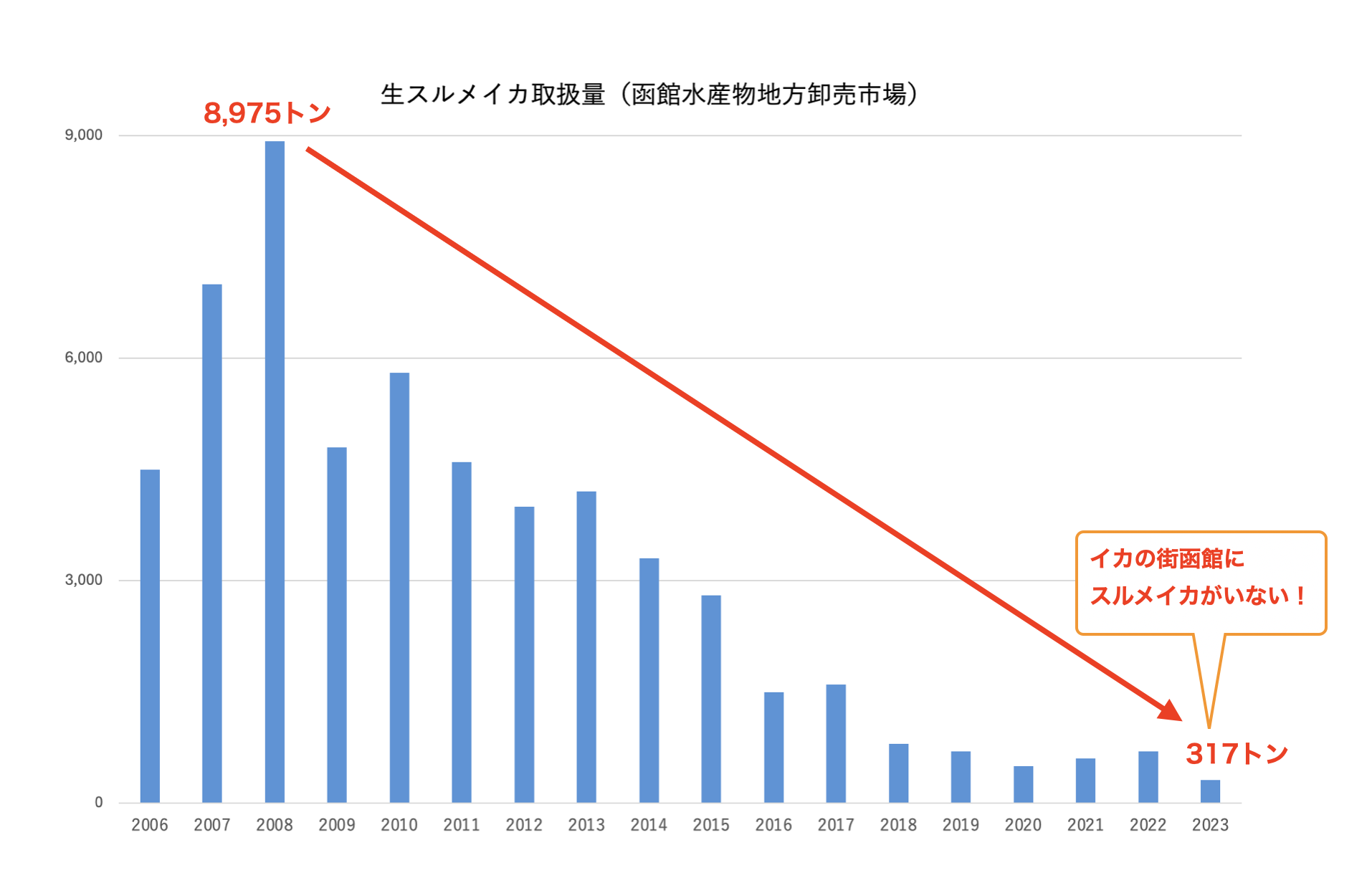 函館と言えばスルメイカ。夜煌々とライトで海を照らすイカ釣り漁船は函館の名物でもあります。しかしスルメイカの水揚げは2008年の8,924トンをピークに下がり続け、昨年は317トンと最盛期のたったの3.6%しか獲れてません。イカ釣り漁船は港に繋がれたままです。