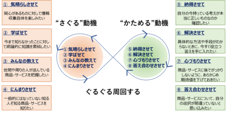 最後はパルス型消費行動およびバタフライサーキットモデルです。パルス型消費行動はGoogleが2019年頃から提唱する消費行動モデルです。AIDMAに代表されるように興味関心を持ってから購買行動に至るまでの一連のプロセスがシーケンシャルに行われるというのがこれまでの消費行動の考えであったように思えます。一方でパルス型消費行動とはある瞬間突発的に購買行動に至るモデルを指します。パルス型消費行動を起こす背景としてGoogleはバタフライサーキットモデルというものも同時に提唱しています。これは購買に至るまでの消費者心理として「気晴らしさせて」「学ばせて」「みんなの教えて」「にんまりさせて」「納得させて」「解決させて」「心づもりさせて」「答え合せさせて」という8つの項目がぐるぐると周回する思考状態を指しています。つまりパルス型消費行動は単なる衝動買いではなくバタフライサーキット型の思考があって発生する消費行動であると言えます。この背景にはスマートフォンおよびSNSの普及が大きく影響していると見てよいでしょう。