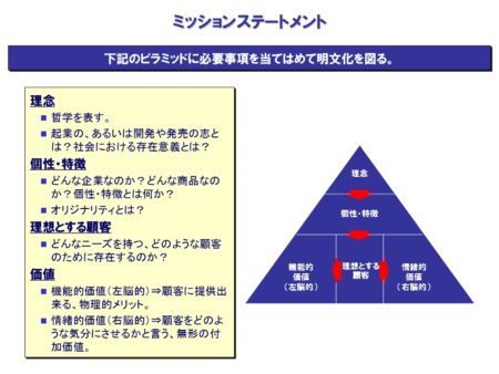 一番上は「理念」です。そのベースはどんな人を笑顔にし、どのように持続可能な社会に貢献するかという背景のもと、「何故わが社が存在するのか?、何故この商品を作ったのか?売るのか?」と言った志や、社会における存在意義を明確にすることです。その対価として売上と利益がついて回るわけですから。二番目は理念のもとにどんな「特徴・個性」があるのか、企業の特徴、商品の特徴や個性を整理します。理念と特徴や個性が名言されると、3番目に「理想的な顧客」が整理されます。いわゆるターゲットです。理念と特徴や個性の恩恵を最も受けると考えられるターゲットが「どんなニーズを持つ?、どんな属性の人か?」を可視化します。そして最後に顧客に対して、どんな「機能的価値(左脳的)」と「情緒的価値(右脳的)」を提供することが出来るか?を整理します。特に「情緒的価値(右脳的)」が大きなポイントです。
