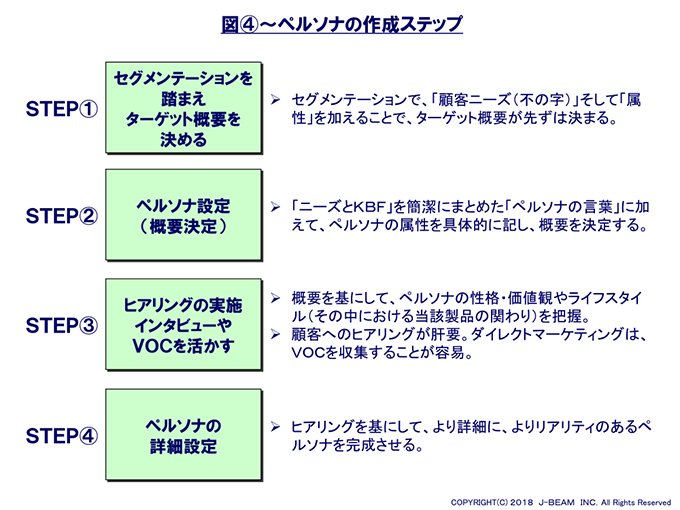 Vol⑦では、セグメンテーションを行えば、その市場細分化した中で狙う同質なニーズを持つ集団には、どんなターゲットが居るのか、「ニーズと買う時の理由であるKBF」を明確に記して、ニーズに加えて代表的な属性を整理して、仮想人物を描くペルソナの作成をお伝えした。
