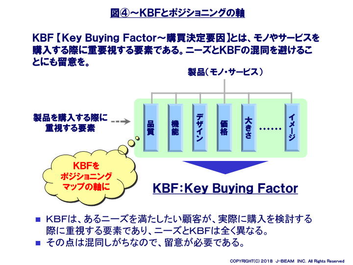 KBFの抽出であるが、良くある間違いが「ニーズとKBF」の混同である。例えばマッサージチェアを買う時のKBFを考えた場合、例えば思い浮かぶ項目として「心地よくなりたい、辛い肩の凝りをほぐしたい、デザインを気にする、価格が安いのがいい、部屋に置けるサイズの大きさがいい・アフターサービス・・等々」と出た場合、最初の「A:心地よくなりたい」、そして「B:辛い肩の凝りをほぐしたい」はニーズであり、しかも異なるニーズを持つAとBと言う集団、つまりセグメントでありターゲットである。