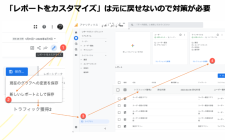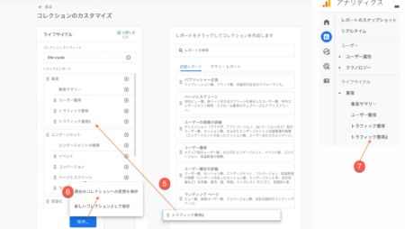 上図の手順で「新しいレポートとして保存する」を選択している理由は、「レポートをカスタマイズ」はデフォルトに戻す機能が無いからです。特に複数のユーザが閲覧するGA4アカウントでは「公式ヘルプと画面が違う!」などの社内トラブルを避けるためにも、「新しいレポートとして保存する」を選択しておかれることをお薦めします。選択したあとは、末尾に2などの番号を付与するなどして、以下の手順で左メニューに表示させておくようにされてみて下さい。