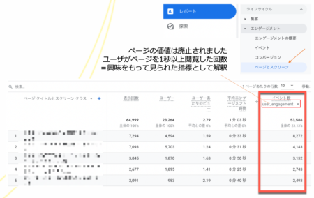 そこでデフォルトの機能だけでページの価値の代用をするなら一番近い値のひとつに「user_engagement」があります。図の様に、レポート>エンゲージメント>ページとスクリーンで、イベント数のプルダウンメニューから、user_engagementを選びます。この値は、ユーザがページを1秒以上閲覧した回数を表していますので擬似的に興味をもって見られた指標として解釈すれば「ページの価値」の代用として使うことができます。