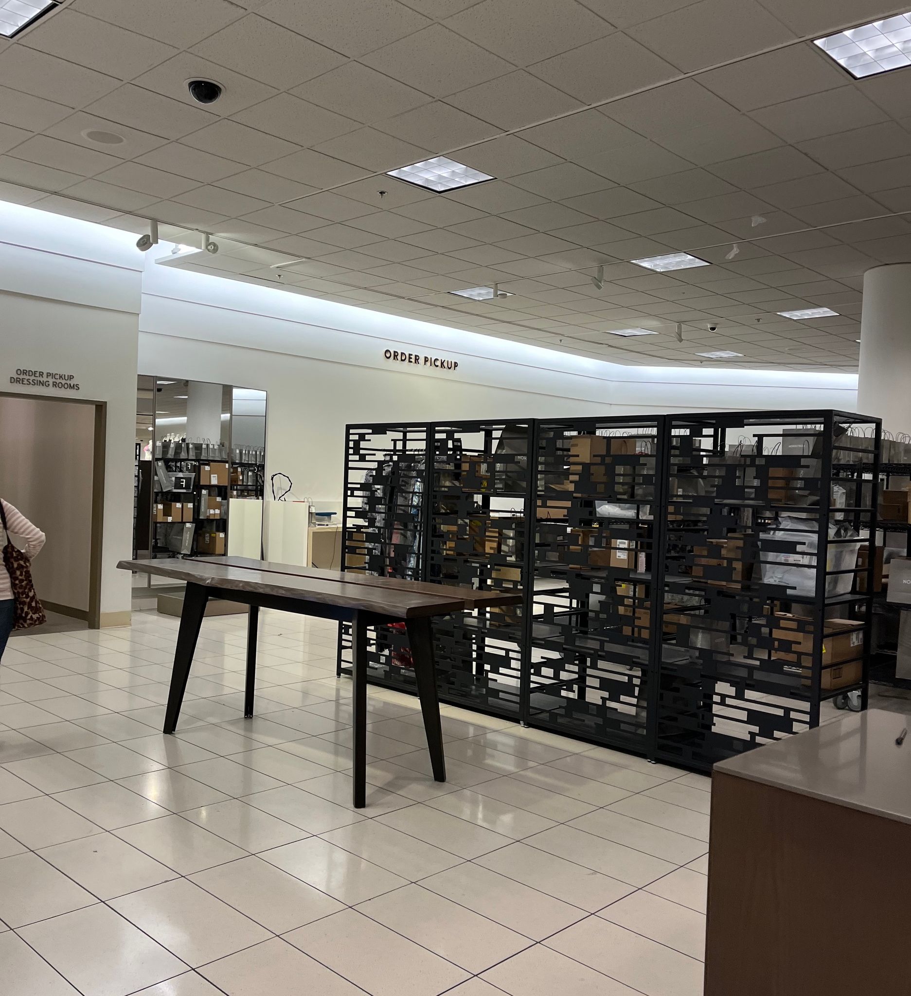 今までのレポートで何度かご紹介したことがありますが、オンラインで注文して店舗で受け取る”Buy Online, Pick Up in Store -BOPIS”は、消費者にかなり浸透してきております。最近では、写真にあるように、大手百貨店でもかなりのスペースをこのピックアップ用に確保し、さらにはピックアップした衣服をその場で試着できるようにもなっています。