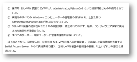 先日2月13日に岡山県精神科医療センターが公表した、サイバー攻撃(電子カルテなどの院内システムが身代金要求型コンピュータウイルスに感染し、全カルテが閲覧できなくなった2024年の事件)の調査報告書には、初期侵入経路として以下の可能性があると記載がありました。