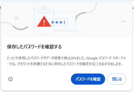 Google Chromeに記憶させているパスワードが漏洩した可能性がある際に出るポップアップこのポップアップが出ても、変更しないで利用し続けている例もあるのでは。