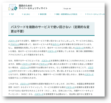 ところでこのパスワードについて、ここ数年で認識が変わっていることはご存じでしょうか。まだ一部のASPサービスなどでは、定期的にパスワードの変更を求められることがありますが、世界では米国国立標準技術研究所(NIST)を皮切りに「パスワードの定期的な変更は不要である。むしろ定期的な変更は危険である」という認識が広まり、日本でも内閣サイバーセキュリティセンター(NISC)からパスワードの変更頻度について、定期変更する必要はなく、流出時に速やかに変更すればよいという指南に変わってきています。