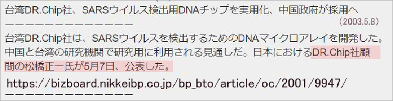 2003年(平成15年)中国でSARS流行、台湾の遺伝子検査チップ開発会社DR.Chip社が世界でいち早く開発実用化に成功し、中国政府が採用に経ったこと、当時DR.Chip社の顧問に就任していた筆者が新宿の京王プラザホテルにて日本国内に向けて発表ししました。