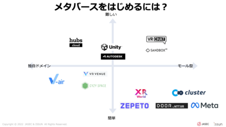 音声SNSのクラブハウスのような「多対多」形式のポスターセッションは、セミナーやzoom会議のような「一対多」では成立しません。ところがメタバース技術ならこの「多対多」形式の会話が成立します。まずは「無料で誰でも使えるメタバース会場」を見つけることが課題でした。下図は現時点で日本で利用できる主なメタバース空間の一覧で、ここから選ぶことになります。