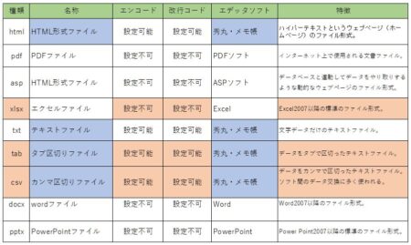 エクセルファイルは、表計算ソフトExcelで開き編集可能ですが、文字コードや改行コードはデフォルト設定で固定されています。タブ区切りファイルやカンマ区切りファイルは、テキストファイルのエディタ「秀丸やメモ帳」で開き編集可能です。文字コードや改行コードもシステムの設定に合わせて変更可能です。