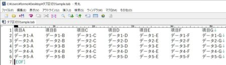 ②のタブ区切りファイル(tab)は、データ間をタブで区切っており、改行で各レコードのおわりを示しています。