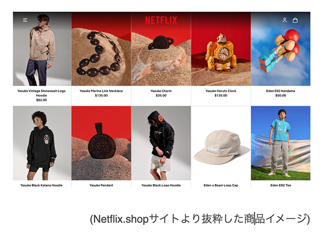 先日発表されたNetflix.shopは、番組や映画をベースにした商品を限定販売するオンラインストアで、厳選された高品質のアパレルやライフスタイル製品を取り扱います。まずは、今年初めに開始された2つのアニメシリーズの”Yasuke”と”Eden”をベースとし、新進アーティストや日本のBeamsなどとのコラボレーションによるアパレルとアクションフィギュアを販売しています。今後はフランスを拠点とするミステリーTVシリーズ”Lupin”から、ルーブル美術館とのコラボレーションによる装飾品の販売も予定しているようです。まずアメリカでスタートし、今後数ヶ月以内に世界の各国でも展開する予定とのことです。