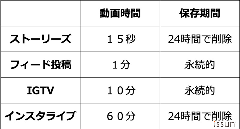 先ほど図示した土屋鞄製造所さんのランドセル対象層リサーチ結果のとおり、SNSサービスのインスタグラムの動画機能「IGTV」とライブ配信機能「インスタライブ」はインスタグラムユーザ層ともマッチしており効果的です。いずれもインスタグラムが提供するごく普通の動画サービスですが、今回土屋鞄さんがマーケティング面で工夫されているな、と気づいた点が、3回に分けて配信された点です。第1回:ランドセルの基本について、第2回:土屋鞄の新作モデルについて、第3回:多かった質問へのお答え、と段階をおって自社ブランドへ興味関心の少ない生活者層から広くとりこみ、自社ブランドへ誘導し、最終的にライブ配信で強力な購入検討層へと絞り込んでゆく、いわゆる「購入者の心理ステップ」を活用されています。毎週1回行われ、第一回と第二回は「IGTV」動画でそれぞれ6分、10分と短めで構成もシンプルな動画です。最後の第三回は「インスタライブ」で午後8:30からLIVE配信されていました。この事例をご紹介すると、意外に10分間の動画や1時間のライブなど長尺の動画が配信できることをご存じ無い方が多かったので、以下にインスタグラムが実施している動画サービスをまとめておきます。
