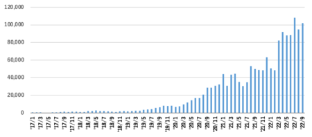 次の棒グラフは一般社団法人JPCERTコーディネーションセンターが事務局の「フィッシング対策協議会」が毎月発表しているフィッシング報告件数の月次データです。ご覧の様に全体的に右肩上がりではありますが、2020年に入ってからその勢いが増していることがよくわかります。2017年で最も多かった月は1,396件(10月)でしたが2022年9月には過去最高の107,948件を記録しました。5年で77倍に増加した計算になります。尚、この件数はフィッシング対策協議会に報告があった件数です。したがって実際に発生した件数の一部分であり実態としてはもっと多いフィッシング詐欺が発生しているものと推測されます。