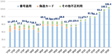 フィッシングによって入手されてしまう情報の代表格はクレジットカード情報でしょう。次のグラフは一般社団法人日本クレジット協会発表の「クレジットカード不正利用被害の発生状況」に関するものです。こちらも右肩上がりで増加している様子が見て取れます。2017年Q1(1~3月)の被害総額は57.2億円でしたが2022Q2(4~6月)には106.4億円にまで拡大しています。内訳を見ると偽造カードによる被害額は近年ほとんどなくなり、その代わりに番号盗用による被害額が増えています。2017年Q1の番号盗用被害額は40.3億円でしたが、2022年Q2には100.8億円にまで拡大しています。不正利用の被害額が増えている理由はフィッシング件数の増加によるものでしょう。関係者による努力は最大限行われていると推測しますが残念ながら番号盗用被害額は時間の経過とともに増えています。