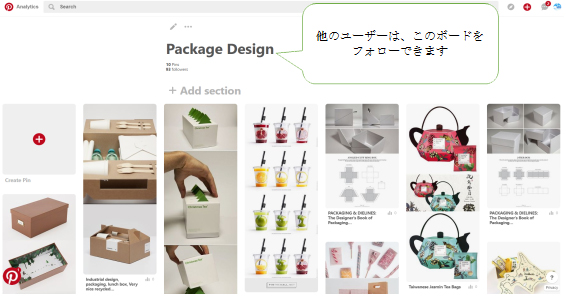以下は、私のPinterestのトップ画面です。各フォルダ(ボード)の中に、集めた画像が入っています。テーマは、パッケージデザイン、Eコマースの知識、色に関する知識、商品アイデアなどです。