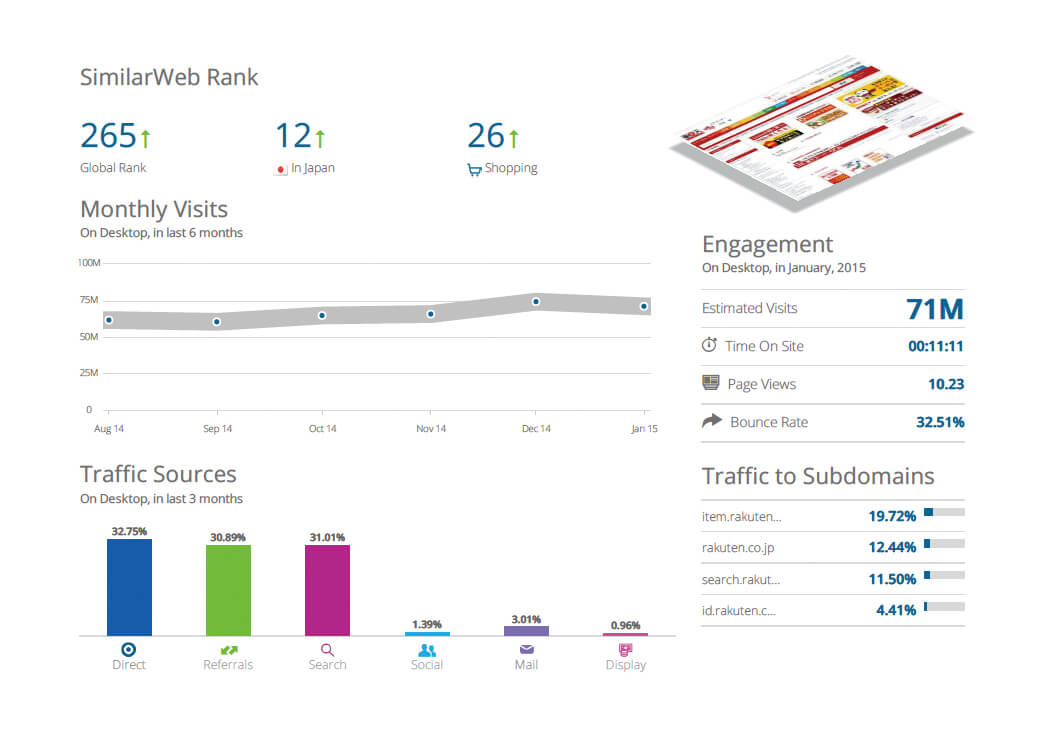 さて、今回このSimilarWebを使って何を調べるかというと、2月に決算報告書、IR資料が出た楽天、アマゾン、ヤフーショッピングのデータですね。