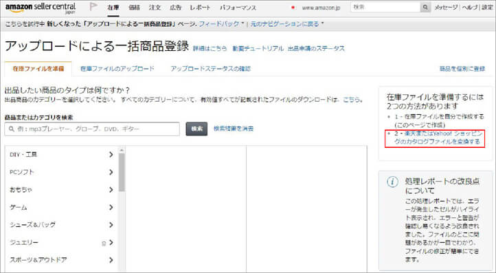 セラーセントラルの在庫>アップロードによる一括商品登録