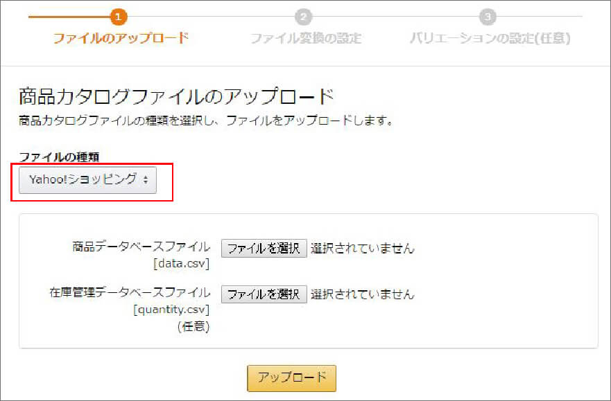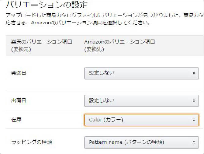 楽天またはYahoo!ショッピングのファイルがバリエーションを含む場合、各バリエーションをAmazon.co.jpのバリエーションに変換する設定をします。
