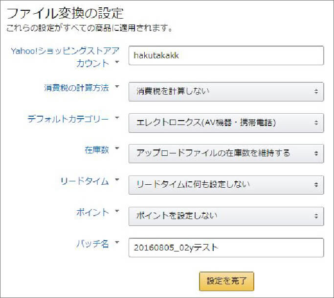 楽天またはYahoo!ショッピングそれぞれで、消費税の計算方法などファイル変換時に全商品に適用される設定を行います。