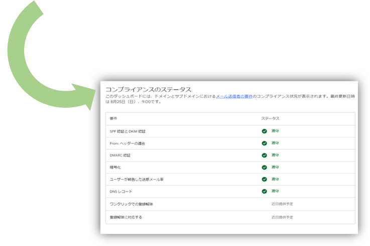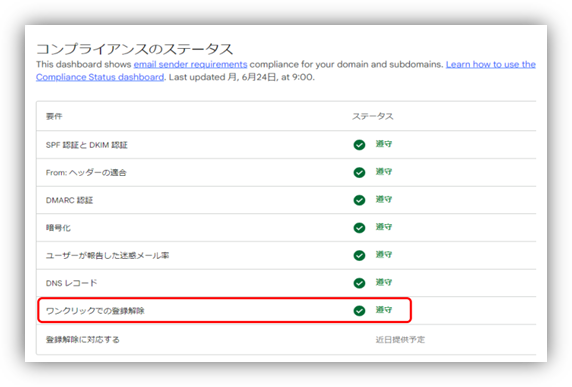 メール送信者の負荷を減らすことを意図してか、Postmaster Tools はV2がリリースされており、「コンプライアンス ステータス ダッシュボード」というガイドライン規定の各要件を正しく対応できている(=準拠)・対応できてない(=要対応)状況を一目で確認できるようになっています。