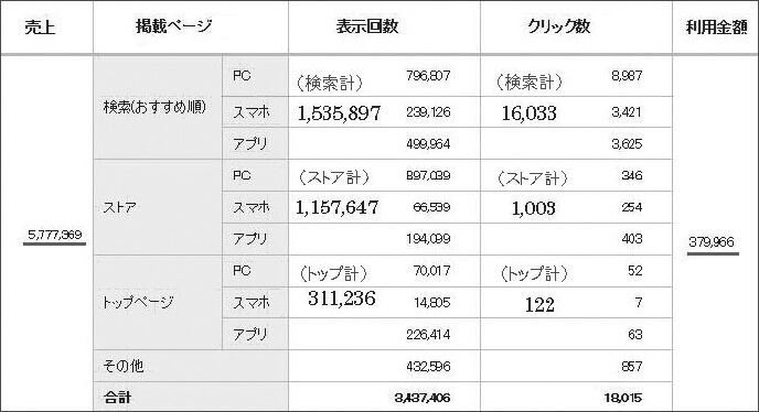 PRオプションの掲載場所は、変更される場合があります。統計では検索、ストア、トップページ、その他と4分類。そしてPC、スマホ、アプリ別のセッション数とクリック数がわかります。広告効果につながるクリック数は、PC、スマホ、アプリともに「検索(おすすめ順)」が大半を占めているということがわかります。効果測定は、「検索(おすすめ順)」に的を絞っていいと判断されます。