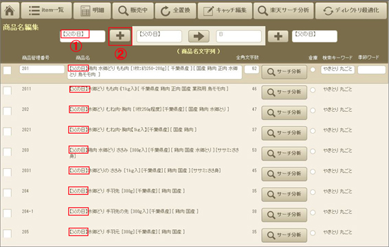 楽天内検索でいい結果を出す〔商品名〕最適化の法則は簡単に見いだすことはできませんが、タイムリーに一括編集し、その結果を検証、よりよい方向に導くことができると思います。