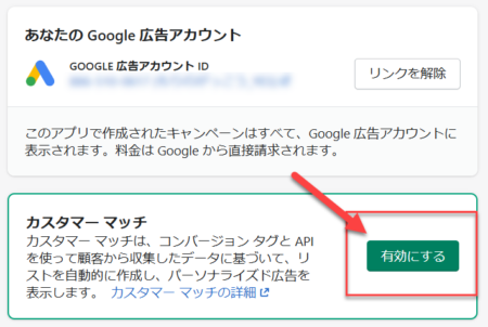Shopifyの管理画面に飛ぶので、カスタマーマッチ > 有効にする を選択
