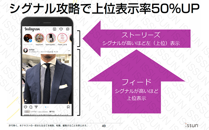 ただ、そこに「インスタグラムの上位表示」の特性を理解した戦略がなければ、最大で「2倍」取りこぼしていることになるようです(インスタグラム談)。ここでいう上位表示とは以下の通りです。ストーリーズでは左に、フィードでは文字通り上位表示がポールポジションですよね。
