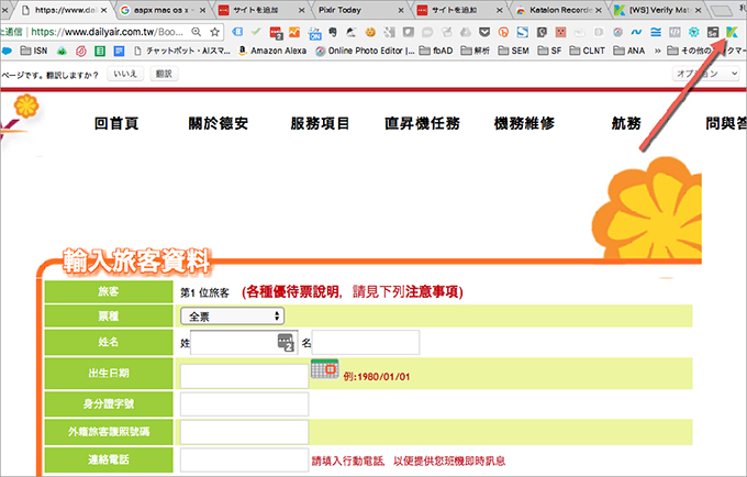 利用したいサイトの「入力フォーム」というのは、台湾の国内航空会社の航空券予約サイト、