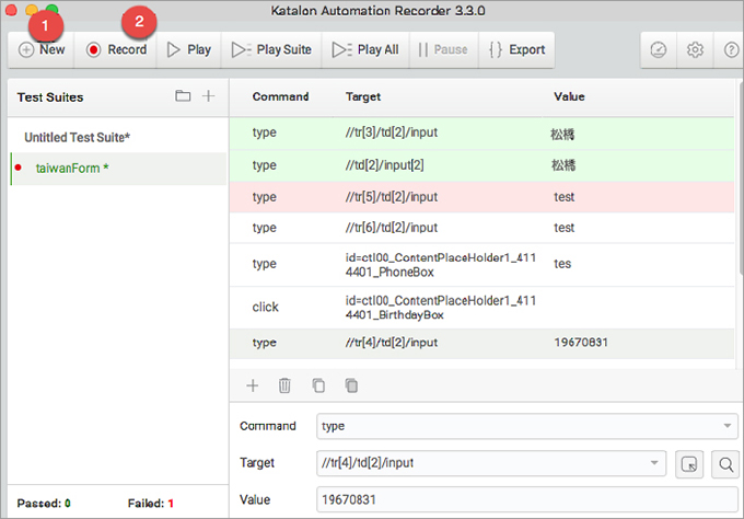 ① New で、適当な名前を作っておき、② Record を押して、フォームを入力していきます。