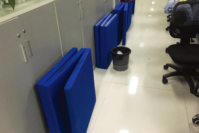 従業員の席の後ろには、仮眠用マットレスが置いてありました。一人1枚ずつ、全員に。日本は働き方改革などといっていていいのだろうか…、と少し不安になります。