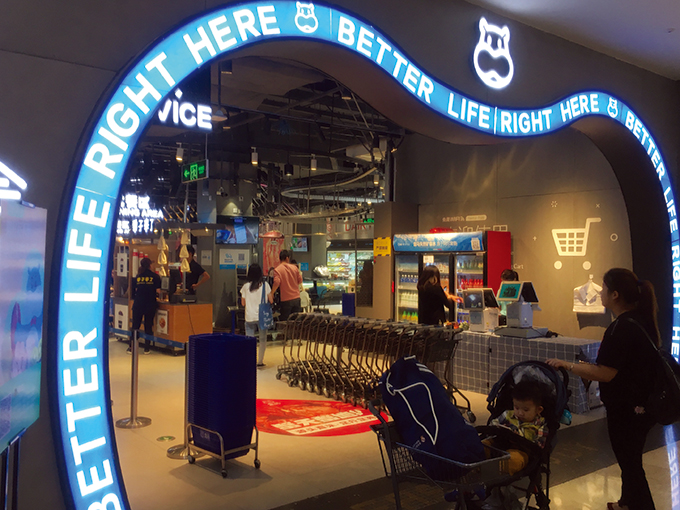 昼食前に、最近出店したというアリババグループの生鮮品スーパーを視察しました。ライバル企業テンセントのお膝元での出店。決済は無人レジでした。