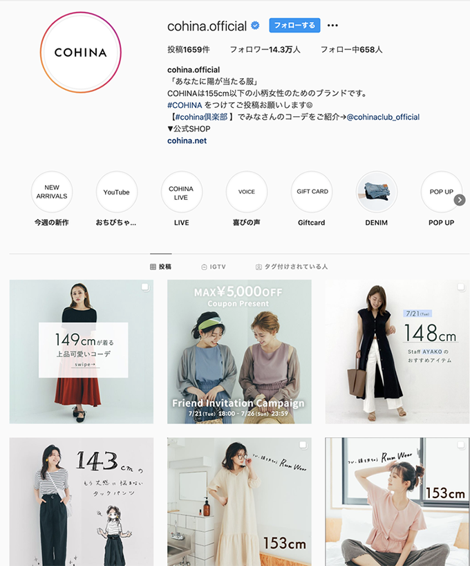 Instagramフォロワー数14.3万人の「COHINA(コヒナ)」(2020年7月22日現在)